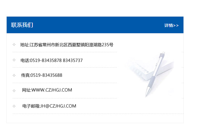 傳真:0519-83435688    郵編:213135    網址:WWW.czjhgj_com.zjlfyc.com    電子郵箱:JH@czjhgj_com.zjlfyc.com